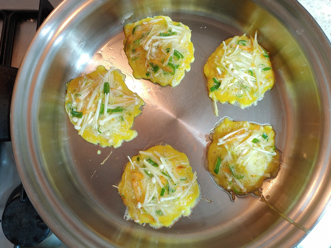 여유를 가지고 식재료를 다루다 보면 기특한 생각이 퐁퐁 솟아오른다. 여유는 고정관념과 습관을 허무는 힘이 있다. 덕분에 기존의 방식을 따르지 않고도 더욱 영양가 있는 음식을 수월하게 만들어낼 수 있다. 라디오를 들으며 놀이터에 간 아이들이 돌아오길 기다리며 저녁을 준비하던 어느 날이었다. 팽이버섯을 사용하면 밀가루 한 스푼 풀지 않고 전을 부쳐낼 수 있다는 사실을 알게 됐다. 팽이버섯 가닥가닥이 계란물을 꼭 붙들어주기 때문이다. 쓰인 재료라고는 팽이버섯, 계란, 파, 당근 땡! 동그랑 땡! 어린이들 반찬 걱정도 땡!