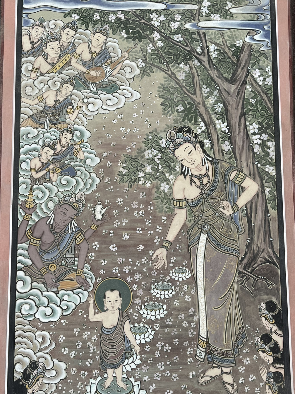 이곳에서 석가모니 탄생 일화를 들으면서 벽화를 찍었다.