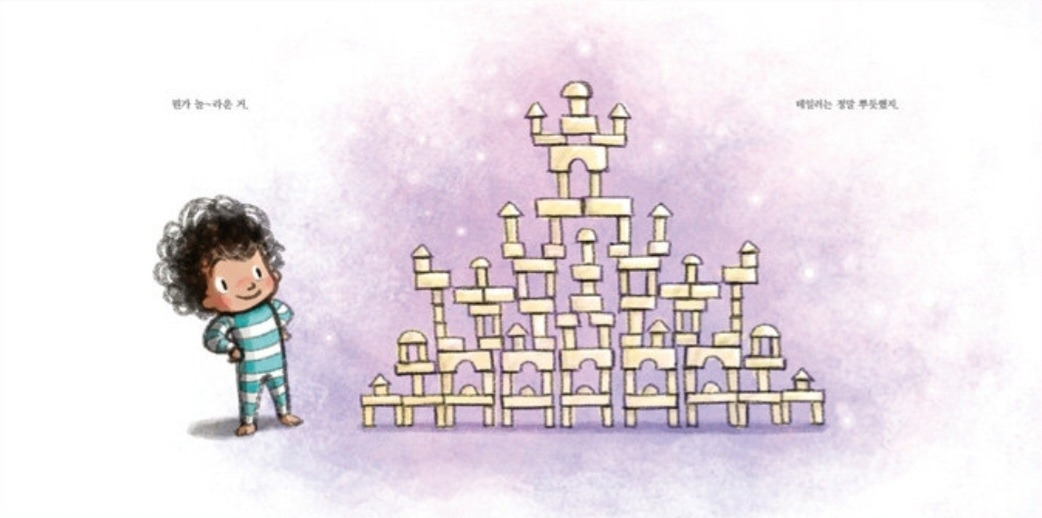 그림책 속 아이가 눈을 빛내며 쌓아 올린 블록이 난데없이 날아든 새들 때문에 무너지고 말았다.