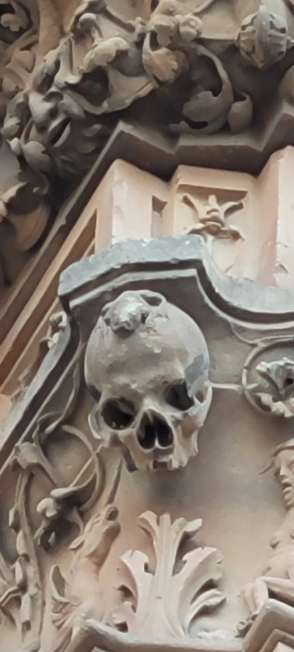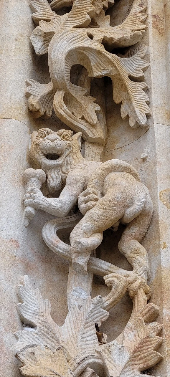 살라망카는 살라망카 대학교를 중심으로 형성된 마을이다. 알폰세9세는 1218년 이곳에 살라망카 대학을 세웠다. 유럽에서 3번째로 오래된 대학이다. 중세 유럽의 최고 대학이었다. 스페인에 한국어학과가 있는 유일한 대학이기도 하다. 한국인 유학생도 꽤 있다고 한다. 이곳은 1539년 세워진 파사드가 유명하다. 은 세공 기법으로 돌을 다듬어 만든 갖가지 동식물 문양이 멋지다. 이게 돌에 새긴 게 맞나 싶을 정도로 세밀하고 섬세하다. 이곳에 숨어 있는 개구리 문양을 찾으면 행운이 온다는 속설 때문에 파사드를 가득 채운 문양을 샅샅이 찾는 관광객들이 북적인다. 오른쪽 기둥 중간쯤 맨 왼쪽 해골 머리 위에 개구리를 찾았다. 행운이 있으려나.