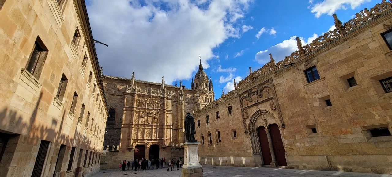 살랑망카 대학 파사드 앞에는 숨은 개구리 부조를 찾는 관광객들로 북적인다. 개구리는 오른쪽 기둥 중간쯤 해골 머리 위에 있다.