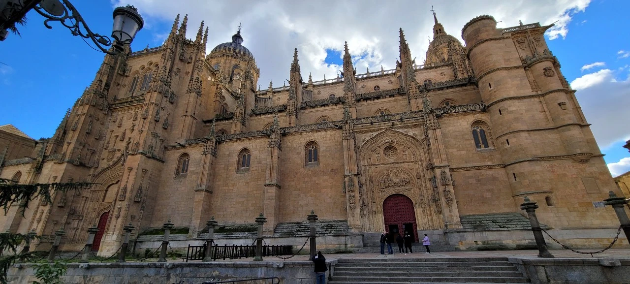 살라망카 대학에서 걸어서 5분 거리에 있는 살라망카 대성당은 2개 성당이 붙어있는 쌍둥이 건물이다. 그런데 이란성쌍둥이다. 먼저 지어진 성당은 12세기 로마네스크 양식으로 지어졌고 16세기 올라간 성당 건물은 고딕 양식이다. 시대가 다른 2가지 건축양식이 한 건축물에 공존하기는 톨레도 대성당이나 마드리드 대성당과 비슷한다. 톨레도나 마드리드 대성당은 하나의 건축물을 오랫동안 짓다 보니 건축가가 바뀌면서 다른 건축양식이 혼재되었으나 살라망카 대성당은 아예 건축 시기가 다른 2개 건물을 연결하다 보니 이란성쌍둥이 건물이 생겨난 것이다.