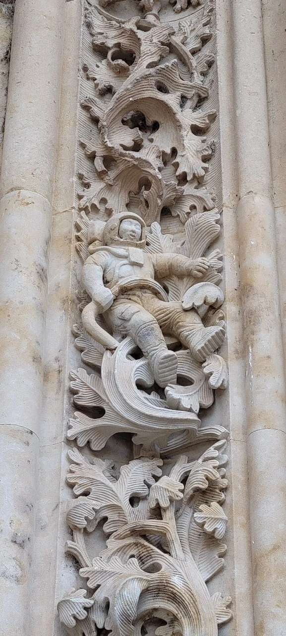 살라망카 대성당도 입구 주위에 새긴 조각들이 화려하다. 플라테스크 기법이라는 불리는 은 세공 기법을 건축에 응용한 것이다. 벽에 우주비행사와 아이스크림 먹는 용의 부조가 눈에 띈다. 16세기 완공한 건축물에 우주비행사와 아이스크림이라니. 타임머신 타고 미래에서 온 조각가가 장난치고 떠난 것인가. 그 비밀을 알고 싶으면 살라망카에 오시길. 스포일링을 삼가자는 차원에서 설명하지 않겠다.