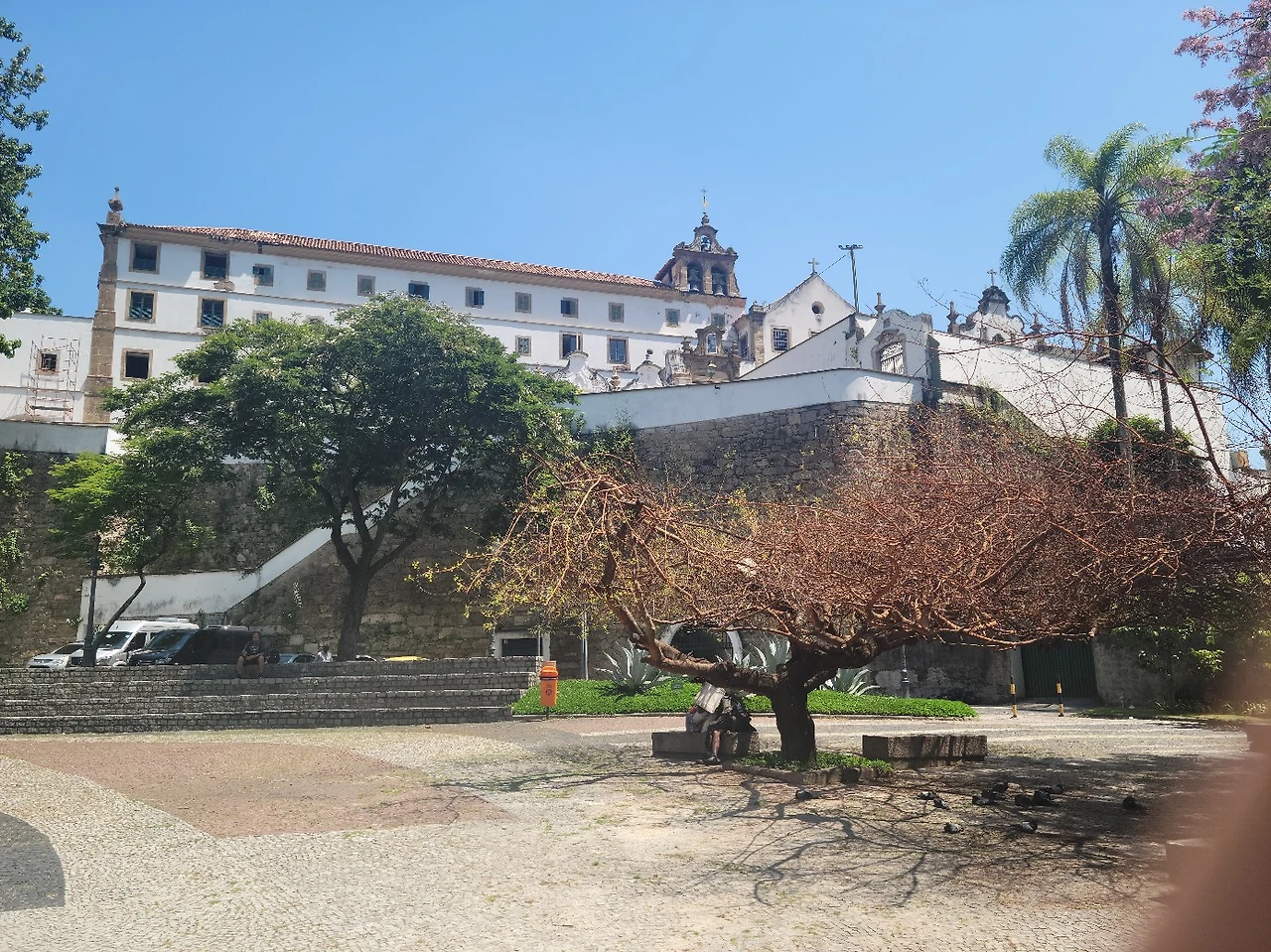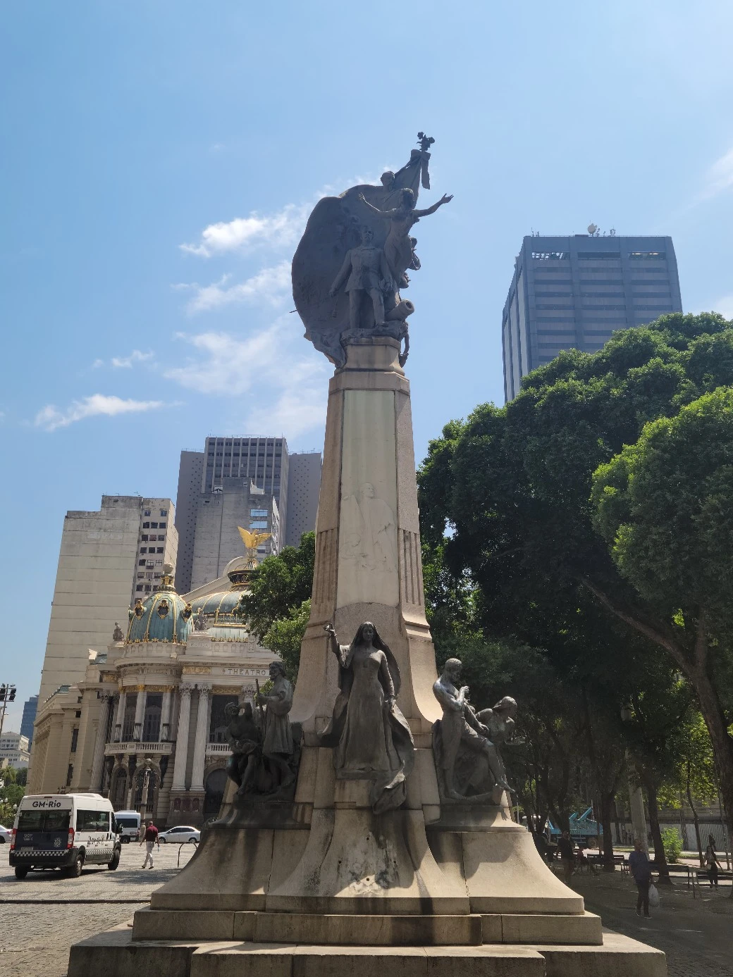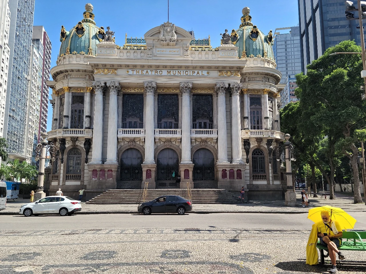 오전 10시30분 집합장소인 치아트로 뮤니시파우(Theatro Municipal 시립극장) 앞에서 모였다. 리우에서 가장 오래된 건축물 중 하나인 치아트로 뮤니시파우에서는 오페라 발레 같은 클래식공연이 열린다.1908년 설립된 건축물이다. 건축물 정면 상단부에 이탈리아 오페라 작곡가 베르디부터 독일 괴테 이름이 새겨져 있다. 건물 외양 곳곳에 번쩍이는 건 인조 금박이 아니라 진짜 금으로 치장했다. 화려하면서도 고풍스럽다. 센트로에서 가장 아름다운 건축물로 꼽힐만하다. 중앙 현관 앞 계단에는 노숙자가 드러 누워있다. 리우 샌트로 곳곳에는 노숙자들이 흉물스럽게 누워있다.