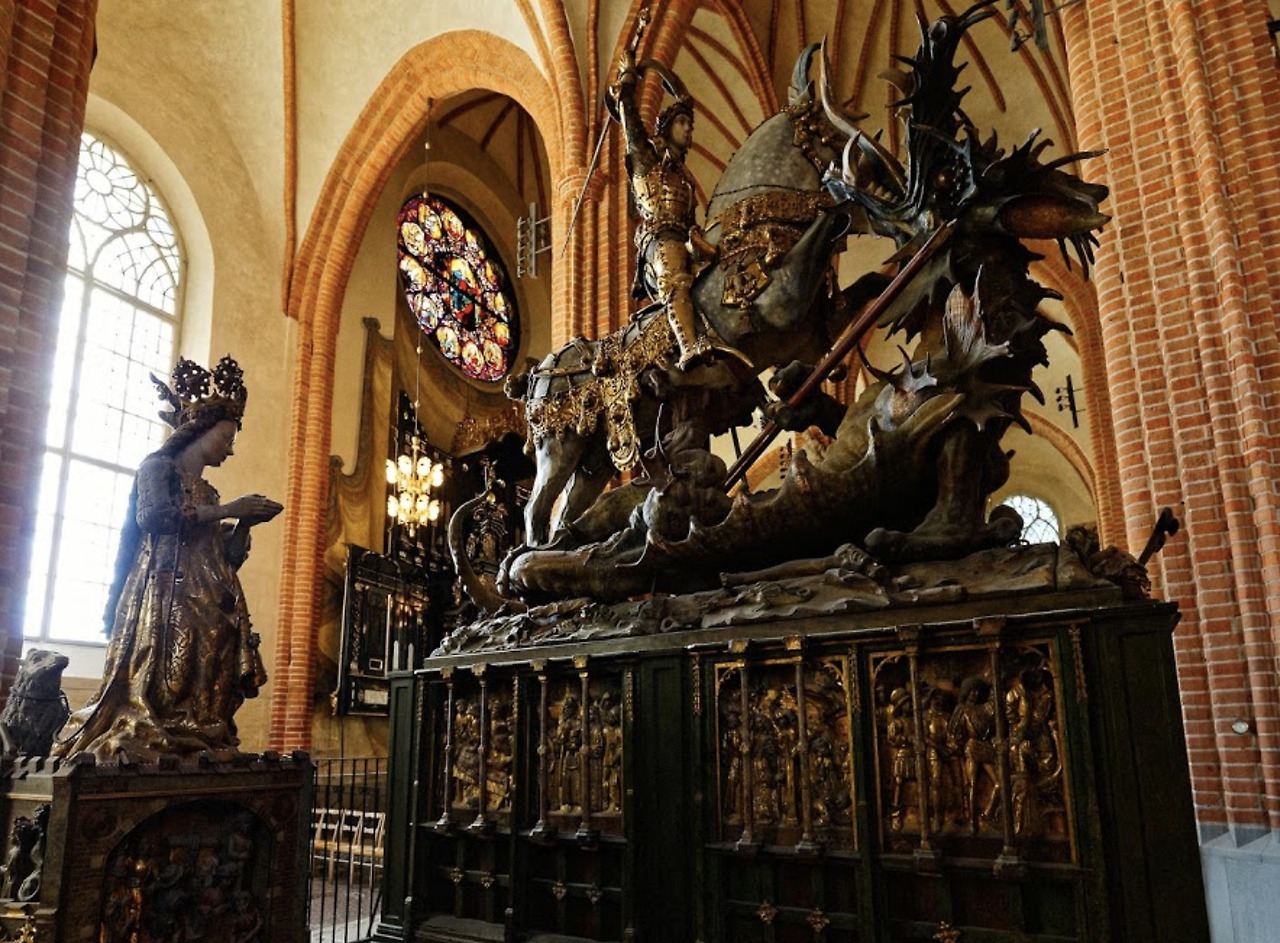대성당은 감라스탄의 중심에 위치해 스톡홀름 시민의 종교적 구심처로 기능한다. 고딕과 바로크 양식으로 지어져 루터파 교회치고는 상당히 호화롭다. 관광객으로 북적이는 출입구를 지나 홀에 들어서면 금박과 은괴로 치장한 구조물들이 스테인드글라스를 통해 들어오는 햇살에 은은한 빛을 발한다. 이곳에는 루터파 교회의 엄숙한 분위기와 어울리지 않은 작품이 있다. 제단을 바라보고 왼쪽에 철갑 옷을 입은 중세 기사가 말을 타고 용을 죽이는 모습의 동상이 서있다. ‘성 조지와 용’의 상이다.