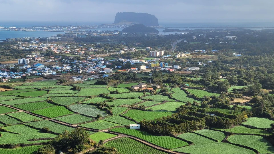 말뫼오름에서는 멀리 성산일출봉과 우도가 한눈에 들어온다. 뭍에는 푸른 밭들이 조각보처럼 펼쳐졌다.