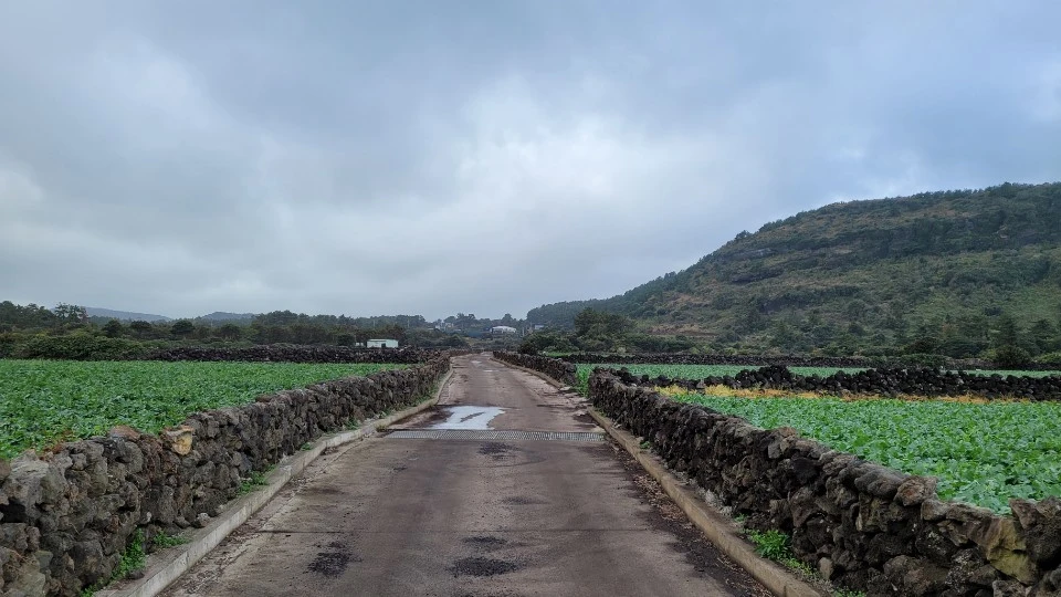 정류장에서 걸어 시흥리 입구에 도착했다. 시흥리 초입에서 말뫼오름까지 사람을 마주치지 않았다. 바람에 섞인 새소리만 들렸다. 현무암으로 쌓아 올린 돌담으로 구분된 밭에 핀 경작물들이 싱그러웠다. 비가 흩날리면서 바람이 불었지만 그리 어둡지 않아 밭에서 자라는 당근을 비롯한 녹황색 채소들이 싯푸르게 푸르렀다. 푸른색 융단을 검은 돌담을 경계로 이음한 조각 이불이 말뫼오름까지 뻗었다. 이 넓은 공간에 오로지 나 홀로라는 걸 깨닫자 고즈넉함과 함께 느슨하게 풀어진 해방감이 목까지 차올랐다. 과하지 않은 행복감이 스멀스멀 올라와 코 끝에서 숨으로 흘러나왔다.