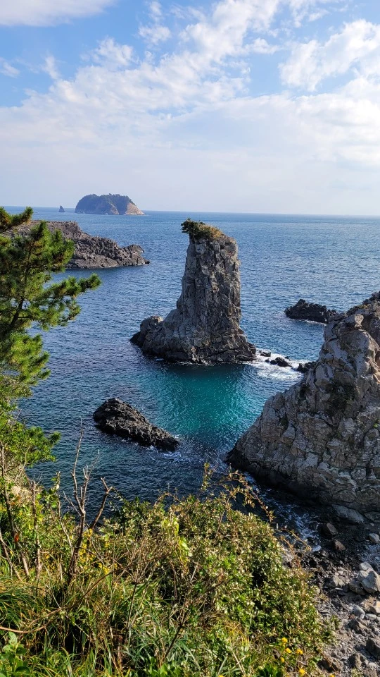 오늘 쪽으로 소나무 숲이 울창하고 왼쪽으로 바다에 접한 돔배낭길을 따라 걸었다. 물이 깊이 흐른다는 속골을 지나 이내 수봉로로 접어들었다. 수봉로는 애초에 사람이 다니지 못하는 길이었다고 한다. 염소나 다닐 수 있을 정도로 길이 정돈되지 않았다고 한다. 이곳을 김수봉이라는 사람이 삽과 곡괭이로 길을 냈다고 한다. 그래서 길 이름이 수봉로. 얕은 숲으로 이어지다 바다로 나왔다가 다시 숲으로 꼬불꼬불 길이 나있었다. 이 길을 혼자서 냈다니 감탄했다. 길은 숲과 바다가 접하면서 이어지다가 일강정 바당올레에 닿았다. 걷는 내내 왼쪽으로 범섬이 조금씩 다가왔다. 사다리꼴 모양이었다가 서쪽으로 갈수록 사다리꼴 뒷면에 숨어있던 범 머리에 해당하는, 본섬에서 떨어진 작은 섬이 나타났다. 범섬이 크고 작은 2개 섬으로 나누어지고 눈으로 섬 절벽 모양을 확인할 수 있을 정도로 가까워졌다.