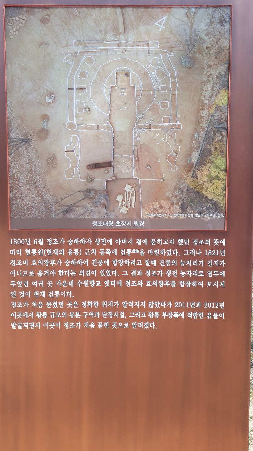 사도세자가 죽고 살얼음판을 걸을 때, 혜경궁 홍씨는 열 살에 불과한 어린 세손빈 손을 잡고, ‘사방에 우리를 죽이려고 하는 자들뿐이니, 세손과 세손빈은 어떤 일이 있어도 서로 사랑하고 지켜주어야 한다. 특히 세손을 동무처럼 아껴 주라’고 당부했다. 혜경궁 홍씨의 가르침을 받은 정조와 효의왕후는 역대 어느 왕과 왕비들보다 부부애가 좋았다고 한다. 그런데 둘 사이에 자식이 없었다니, 안타까운 마음이 든다. 누구보다 불굴의 의지로 살았던 정조였으나, 자식을 낳고 키우는 것이 사람 의지만으로 되는 일이 아니니 참으로 안타깝다 하겠다. 삼신할매는 어디서 무엇하고 있었던고. 세종에게 넘치듯 주었던 아들 복을 정조에게도 조금 주시지, 에고. 부질없는 소리겠지만, 나란히 합장묘 형태로 누운 정조와 효의왕후를 앞에 두고, 안타까운 마음에 중얼거려본다.