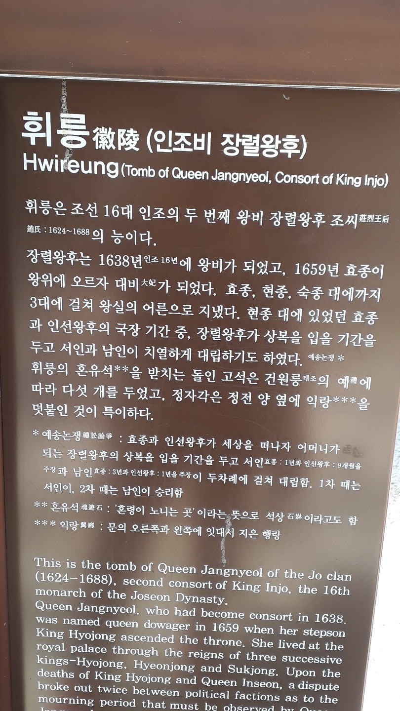 우리는 동구릉에 있는 능 중에서 휘릉에서 가장 오래 서성거렸다. 정자각으로 우리의 시선을 잡아끌어 당긴 휘릉이 능침 안에 잠들어 있는 주인공의 사연으로 우리의 발걸음을 잡았던 탓이다. 다음 생이 있다면 사랑하고 사랑받는 삶이길, 좋은 짝을 만나 꽃길만 걷기를 바라며 휘릉을 떠났다.