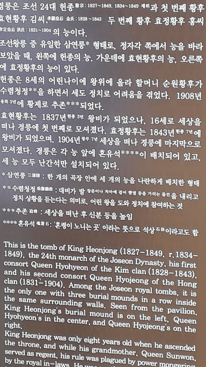 외아들 효명세자를 잃고 웃음을 잃어버린 순조에게 연이어 닥친 두 딸의 죽음은 순조의 명마저 재촉해, 효명세자의 8세 아들이 순조에 이어 보위에 오르니 바로 헌종이다. 잘생긴 데다 목소리까지 좋아 그가 지나가기만 해도 궁녀들을 심쿵 하게 만들었다는 사람. 4세에 아비를 잃고 8세에 조부마저 잃어 조선왕조 역사상 최연소로 보위에 오른 헌종. 그 어린 왕에게 조선이라는 나라는 뭐를 기대할 수 있었겠는가. 4촌은 물론 6촌 형제마저 없이 외로웠던 존재. 첫 왕비를 17세의 나이로 떠나보내야 했던 사람. 23세로 죽어버린 사람. 어찌 이리도 복이 없을까. 헌종 하면 외로움이 연상된다. 그래서 그랬는지, 헌종의 능은 동구릉 능역 안에 부모의 능인 수릉과 가까운 곳에 조성되었다. 그리고 조선왕조의 왕릉 중에서 유일하게 삼연릉 양식으로, 두 왕비가 나란히 헌종의 왼쪽에 묻혀있다. 나란히 줄지어 선, 세 개의 능. 우리는 이구동성으로 말했다.
