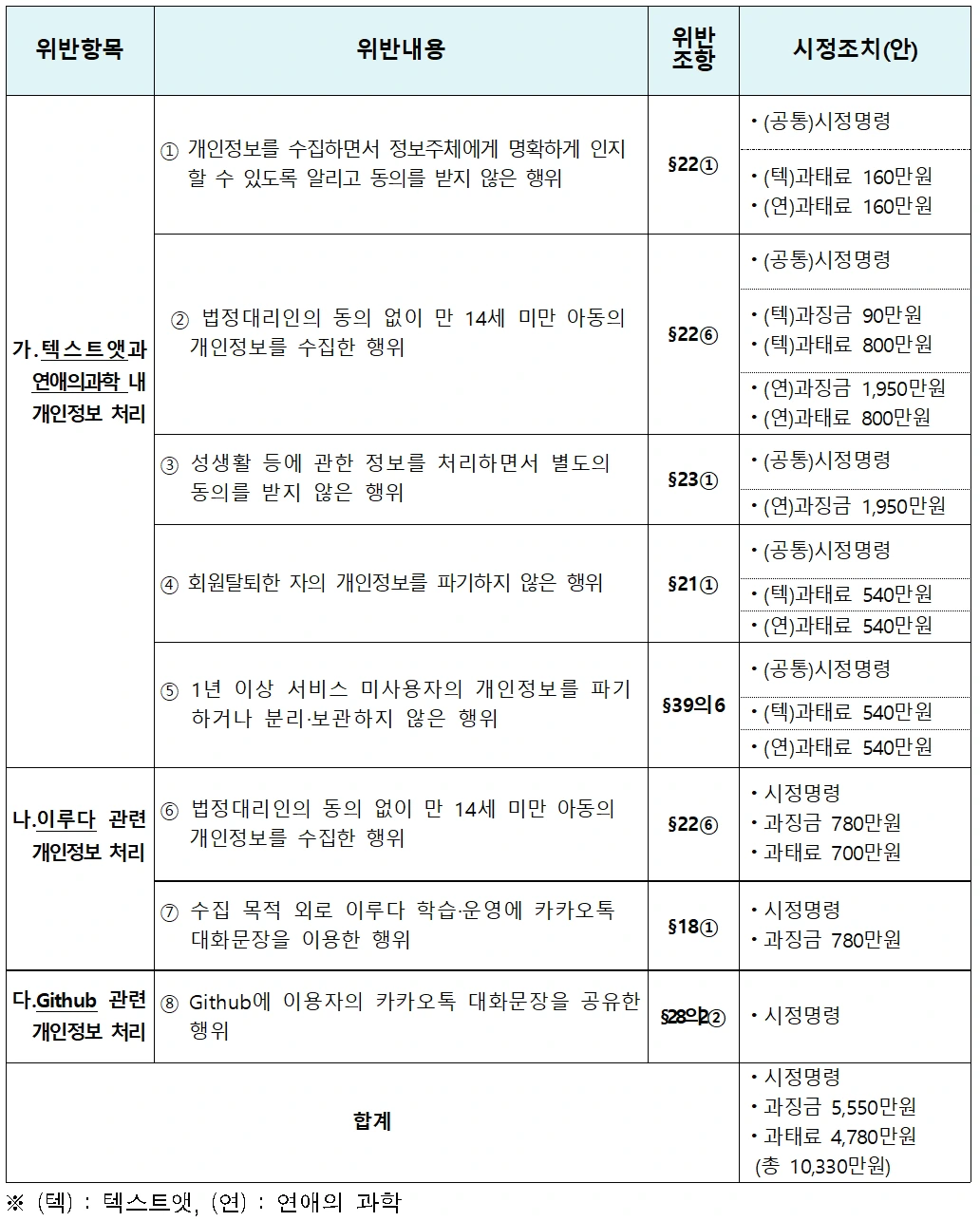 또한 ㈜스캐터랩이 개발자들의 코드 공유 및 협업 사이트인 Github에 올린 데이터도 문제다. 스캐터랩은 2019. 10.부터 2021. 1. 까지 깃허브(GitHub)에 카카오톡 대화 데이터로 학습하는 인공신경망 모델 파일을 게재했다. 그런데 해당 파일에 이름 22건(성은 미포함)과 지명정보(구·동 단위) 34건, 성별, 대화 상대방과의 관계(친구 또는 연인) 등이 포함된 카카오톡 대화 문장 1,431건이 함께 게재된 것이다. 이는 가명 정보를 불특정 다수에게 제공하면서 ’특정 개인을 알아보기 위하여 사용될 수 있는 정보‘를 포함할 수 없는「개인정보 보호법」제28조의2제2항을 위반한 것이다.