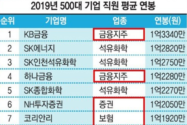 국내 대기업 직원들은 지난해 1인당 평균 7,920만 원의 연봉을 받았다. 이는 전체 직장인 평균 연봉을 훌쩍 뛰어넘는 금액이다. 이 중에서 평균 연봉이 1억 원을 넘는 곳은 33곳. 이 가운데 29곳은 금융사 혹은 석유 화학기업이었다. 1위를 차지한 곳은 KB 금융으로 1억 3,340만 원, SK 에너지가 2위로 1억 2,820만 원, SK인천석유화학이 1억 2,750만 원으로 3위를 차지했다.