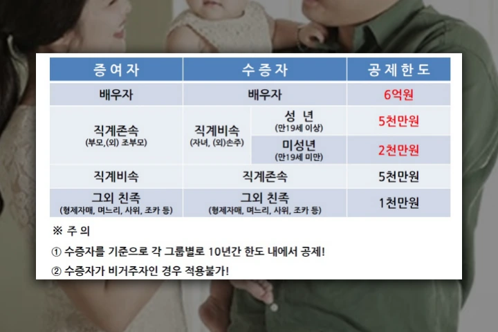 배우자가 아닌 자식이나 부모에게 재산을 증여할 땐 공제 금액이 크게 낮아진다. 부모나 조부모 등 직계존속, 자녀나 손주 등 직계비속 모두 10년 동안 5,000만원의 증여만 공제된다. 하지만 수증자가 미성년자일 경우엔 2,000만원으로 제한된다. 이외 친인척의 경우 1,000만원의 증여는 공제 가능한데. 혈족은 6촌까지, 인척은 4촌까지만 인정된다.