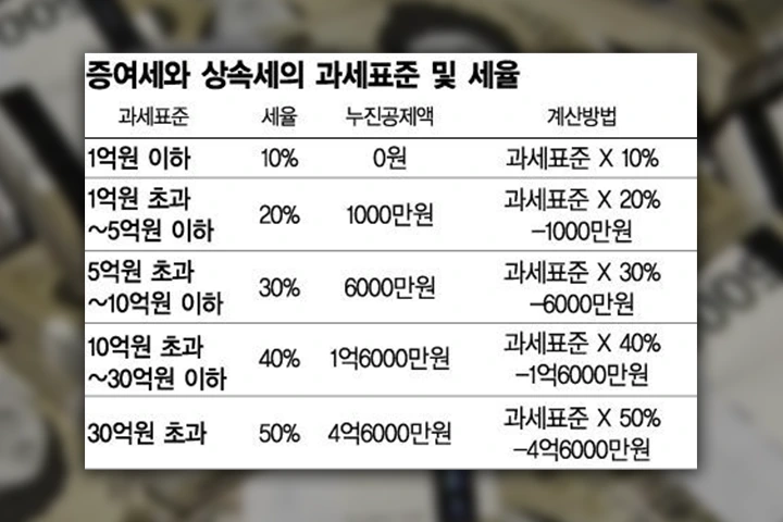 증여 금액이 커지면 증여세율도 높아지는데 1억원 초과 5억원 이하의 경우 20%(누진공제1,000만원), 10억원 이하의 경우 30%(누진공제 6,000만원), 30억원 이하의 경우 40%(누진공제 1억6,000만원), 30억원을 넘는 모든 경우는 50%(누진공제 4억6,000만원)이다. 만약 남편이 아내에게 20억원을 증여했다면 배우자 증여재산공제액인 6억원을 제외한 14억에 대한 증여세가 부과된다. 10억 초과 30억원 이하의 증여세율인 40%를 적용해보면 5억6,000만원이다. 여기에 40%의 누진공제인 1억6,000만원을 제외해 4억원의 증여세를 납부해야 한다.