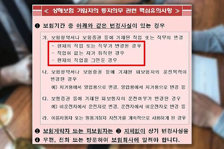 A 씨의 사례처럼 직업·직무 변경 사항을 알리지 않으면 큰 불이익을 받을 수 있다. 사고가 발생했을 때 보험금이 삭감 지급될 수 있으며 심한 경우 보험금을 한 푼도 수령하지 못한다. 또한 회사가 별도로 정한 방법에 따라 계약이 해지되는 경우도 발생한다. 전문가는 “계약 후 알릴 의무를 이행하는 것은 보험 소비자의 권리를 지키는 방법일 뿐만 아니라 건강한 보험 계약을 유지하는 길”이라고 말했다.