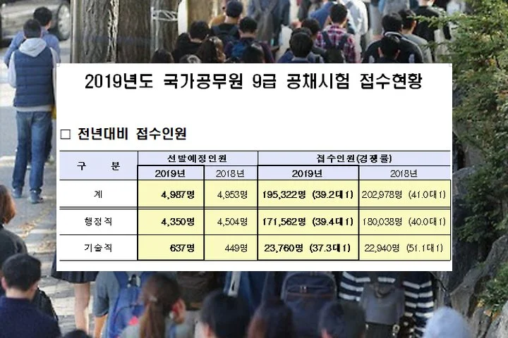 시험 접수 인원도 줄어들었습니다. 2018년 공무원 시험 접수인원은 202,978 명으로 2017년 대비 2만 5천 명 이상 급락했고, 올해는 7천6백 명 정도가 추가로 감소해 195,322 명만이 공무원 시험에 응시한 것으로 드러났죠.
