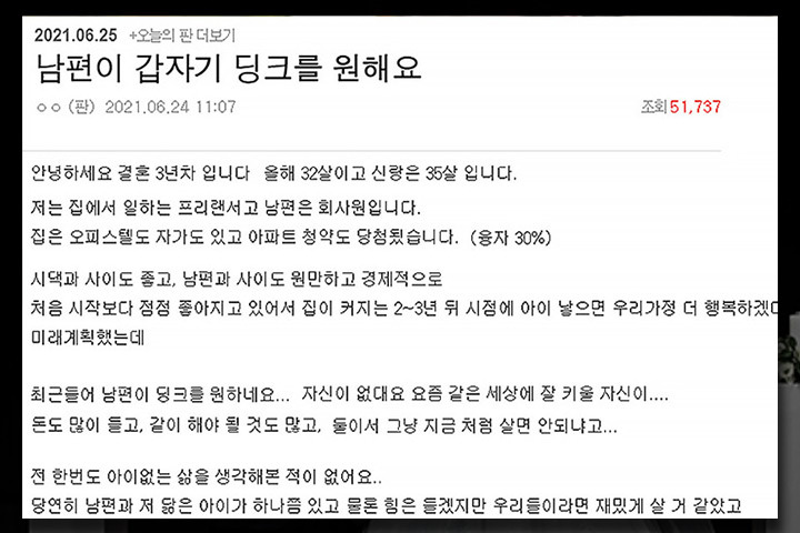 얼마 전 한 온라인 커뮤니티에도 '남편이 갑자기 딩크를 원해요'라는 제목의 글이 올라왔다. 글 작성자는 우선 맞벌이를 하고 있는 결혼 3년 차 부부라고 자신을 소개했다. 그는 "집도 오피스텔로 자가 소유하고 있고 아파트 청약도 당첨되었으며 부부관계도 원만한 편이라 2~3년 뒤쯤 아이를 낳으면 더 행복해지겠다고 생각하고 있었는데, 요즘 들어 남편이 갑자기 딩크족을 원해 어떻게 해야 할지 고민된다"라고 사연을 올렸다.