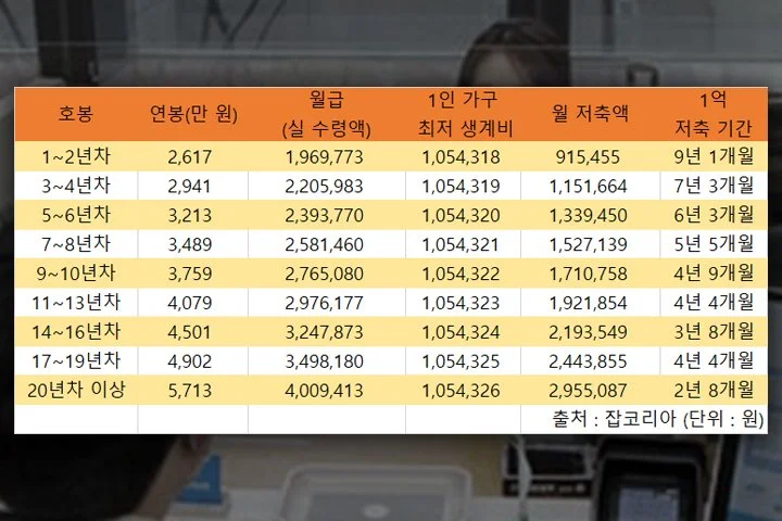 1~2년 차의 세후 월급(약 197만 원)에서 최소 생계비(약 105만 원)를 제외하면 2년 동안 약 2,200만 원의 저축이 가능하다. 또 3~4년 차의 평균 연봉인 2,941만 원을 같은 기준으로 모은다면 2년 동안 2,764만 원을 모을 수 있다. 4년 동안 총 4,964만 원을 모을 수 있다. 이렇게 연봉 인상을 반영한다면 1억 원을 모으는데 필요한 기간은 7년이다.
