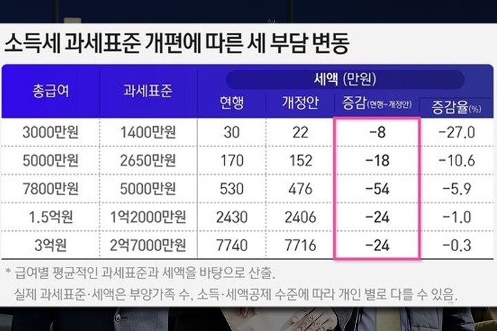 여기서 과세표준 1,400만 원은 연봉 3,000만 원에 해당하는데, 이 연봉을 받는 직장인들의 소득세액은 30만 원에서 22만 원으로 27% 감소할 것으로 계산된다.