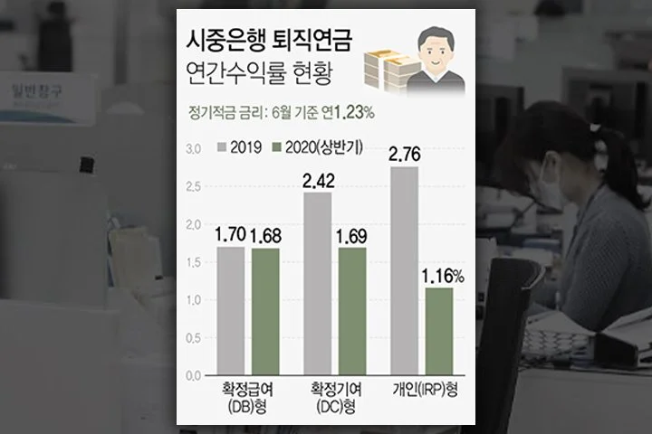 금융감독원에 따르면 올해 상반기 기준 시중은행의 퇴직연금 평균 수익률은 최고 1.69%에 그쳤다. DB형이 1.68%, DC형이 1.69%, IPR형이 1.16%의 수익률을 올리는 데 그쳤다. 작년과 비교해 각각 0.02%, 0.73%, 1.6% 떨어졌다. 여기에 금융사의 평균 수수료인 0.48%를 제외하면 1% 초반대의 수익률을 기록한 것이다. 이는 한국은행이 발표한 올해 6월 은행의 정기적금 금리인 1.23%와 비슷하거나 더 낮은 수준이다.