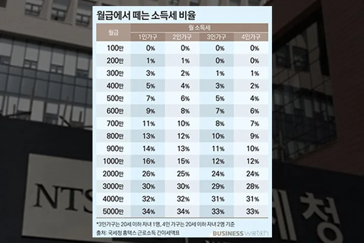 근로소득에서 원천징수되는 소득세는 ‘근로소득 간이세액표’를 기준으로 산정한다. 보통 받는 연봉과 부양가족 수에 따라 소득세가 결정된다. 예를 들어 월급이 200만 원인 1인 가구 직장인은 소득세로 1만 9,520원을 원천징수하지만, 배우자 1명과 자녀 2명(20세 이하)을 둔 4인 가구라면 원천징수되는 소득세는 없다. 이외에 월급이 106만 원 이하인 경우엔 1인 가구라고 하더라도 소득세를 징수하지 않는다.