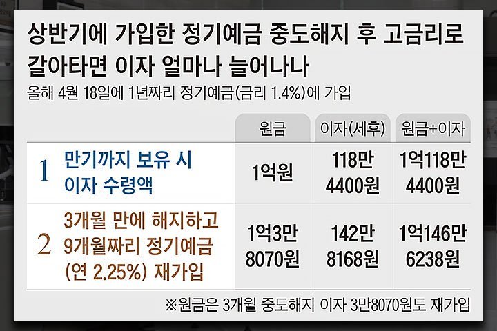 예시를 들어 설명하자면 올해 4월 1억 원의 목돈을 1.40% 금리의 정기예금에 넣었던 사람은 해당 상품을 7월에 해지하고 9개월~1년 뒤에 만기인 2~3% 금리 상품에 새로 가입하는 것이 낫다는 이야기이다.