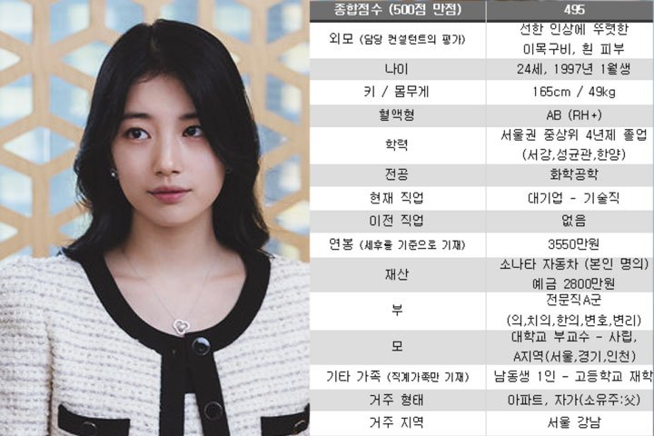 키와 몸무게는 164cm에 48kg이며 혈액형은 B형, 서울 중위권 4년제를 졸업해 대기업 기술 직종에 종사하고 있으며, 연봉이 세후 4,150만 원으로 나타났다. 특이사항으로는 조부가 전직 미국 대학교 교수이고 외조부는 전직 국회의원으로 기재된 내용이었다.