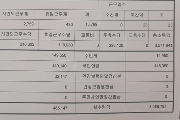 357만 원 벌어 실수령액 308만 원