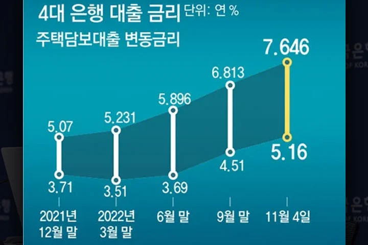 우선 5억 3,000만 원 중 4억 3,000만 원을 빌렸던 주택 담보대출의 경우 금리가 연 2.98%에서 5.50%로 올랐고, 신용대출 금리 역시 연 3.61%였던 이자가 7.48%로 불어났다.
