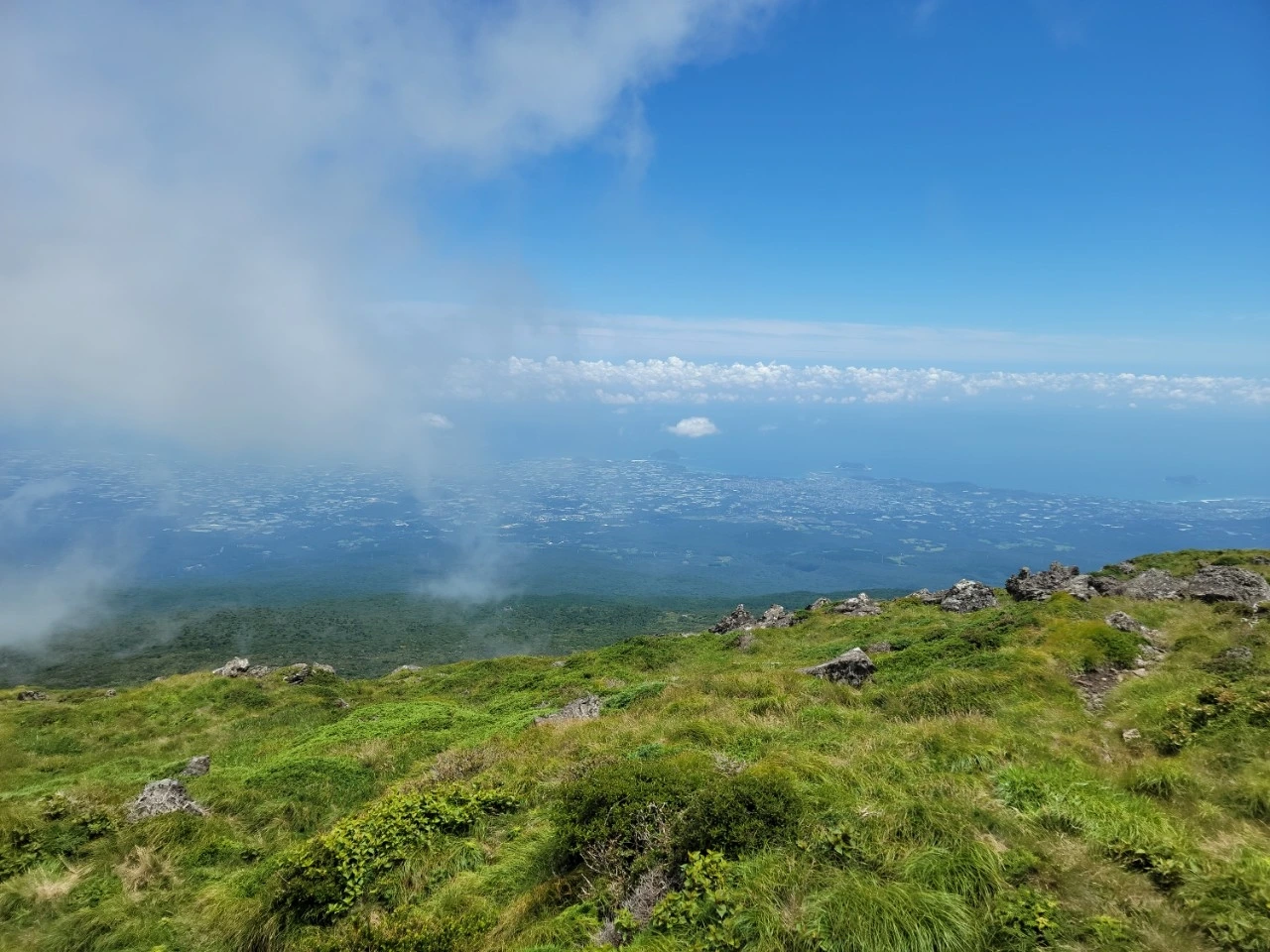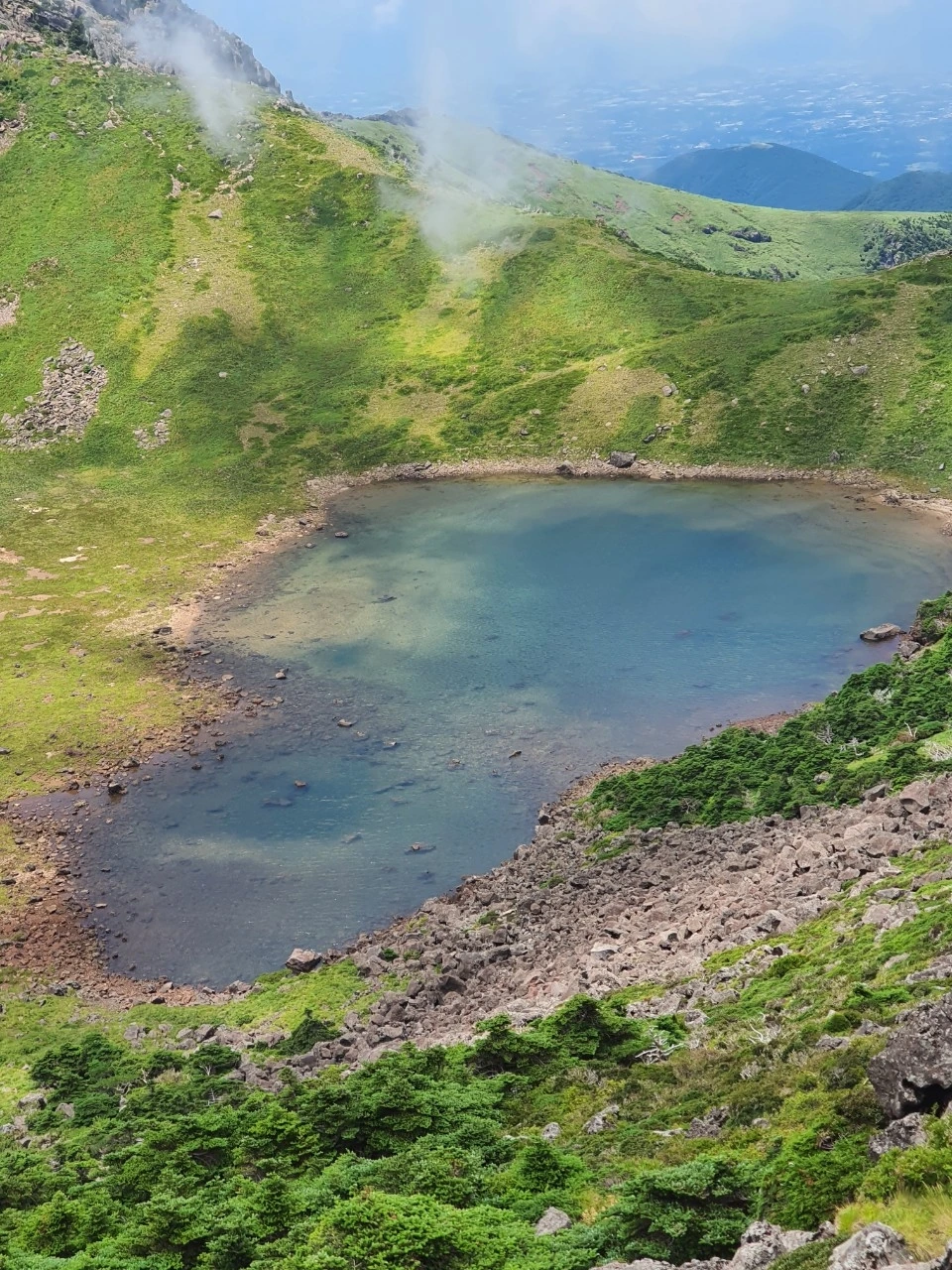 컨디션 난조로 진달래 휴게소까지도 겨우 올랐는데 아들 녀석이 생각보다 씩씩하게 오르는 데다가 두 번째 휴게소까지 왔는데 여기서는 백록담이 얼마 남지 않아서 포기하기도 애매한 그곳에서 다시 걸어 올랐다. 나 자신과의 싸움이 이어졌다. 계속 쉬다 걷다를 반복했다. 랜선으로 보던 완만한 등선은 당최 어디에 있는 것인지. 오르고 또 올라도 100m씩 그야말로 조금씩 전진이었다. 1600 m, 1700 m, 포기할 수가 없는 마지막 지점이 근처였다. 이 지점 어딘가에서부터 두통이 심해지고 눈앞이 몇 번 흐려질 만큼 힘들어서 같이 찍은 사진에는 눈의 초점이 흐릿하다. 아들이 생선 눈 같다고 놀렸지만 뭐라고 할 기운조차 없었다. 게다가 백록담을 향하는 마지막은 끝도 없이 이어진 계단 길이었다. 경치가 좋다며 다들 환호했지만 주변을 볼 여력조차 없었다. 두통을 참으며 걸었더니 몸 상태가 정말 너무 안 좋았다. 정상에 도착하니 바람은 불었지만 날이 정말 깨끗하다 싶을 만큼 맑았다. 다들 정상 인증 사진을 찍느라 줄을 길게 섰고 나는 남편을 그 줄에 세워둔 채 잠시 쉬었다. 백록담을 볼 기운조차 없었다. 팔팔한 아들 녀석은 백록담을 구경하고 인증샷을 찍기 바빴다. 삼대가 덕을 쌓아야 볼 수 있다는 그 귀한 백록담을 구경조차 못하고 정상 인증 줄을 선 남편이 안 되어서 교대를 해주어야겠다 싶었다. 아들 녀석 곁에 가서 백록담을 슬쩍 보았다. 화보 사진에서나 보던 멋진 풍경이었다. 힘이 하나도 없는데도 풍경이 대단했다는 기억이 남는다. 사진 몇 장을 찍고 남편이 백록담을 보도록 줄을 교대해 주었다.