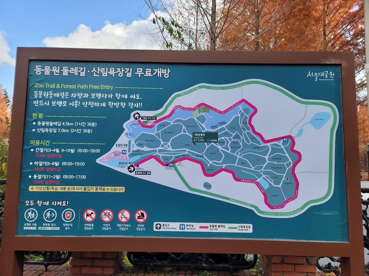 "아... 그냥 등산화 신고 올 걸. 산림욕장 왜 안돼? 산림욕장 길이 동물원 둘레길이랑 중간중간 길이 이어져있어서 괜찮을 거 같은데."