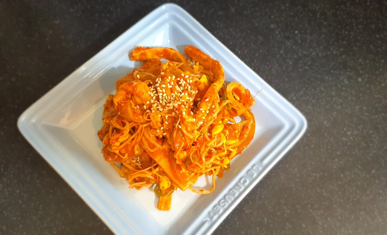 4. 콩나물이랑 야채 넣고 중간 불로 둔 양념 죽을 절반 정도 비비면서 볶아주다가, 야채 숨이 죽으면 어묵도 넣고 남은 양념 죽 싹싹 넣어서 센 불로 볶아주기. (좀 타려고 하면 물 조금 넣어주기)