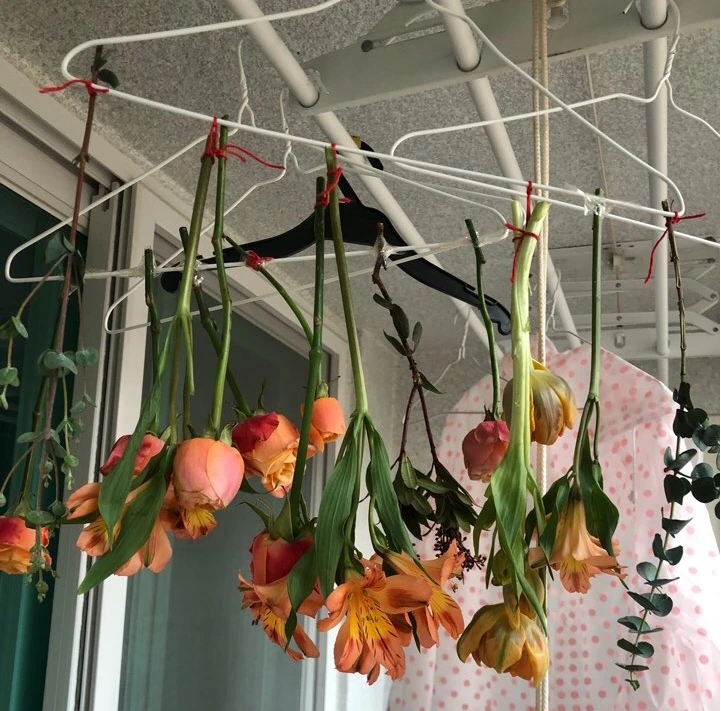 겨울철에 부케 말리는 것은 집안보다는 서늘한 베란다가 낫다고 하기에 베란다에 있는 빨래 건조대에 옷걸이를 걸어 말렸다. 날이 추워 베란다에 나갈 일이 거의 없지만, 꽃이 잘 마르고 있나 한 달 간은 수시로 베란다에 가서 꽃의 안부를 확인했다. 꽃이 바닥에 떨어져 있으면 다시 옷걸이에 단단하게 묶어 고정시켰다.