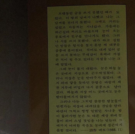 “모두 다 꽃씨들을 가지고 있다니. 작은 씨앗들이 어떻게 큰 꽃이 될까.”(p.88)라고 말한다. 여기에서 작은 씨앗은 ‘자신’을 가리킨다고 생각했다. 시적 화자가 처한 가난의 상황 속에서 훗날 큰 꽃이 되기까지의 과정을 떠올리며 막막함 내지는 두려움을 느끼는 것 같았다. 모두 다 꽃씨를 갖고 있지만 유독 나의 씨앗만 작고 보잘것없어 보이는 것처럼 말이다. 상장이 무의미해질 만큼 직접적인 생계의 위협을 받는 이의 초조함과 불안함이 크게 느껴지는 대목이었다.