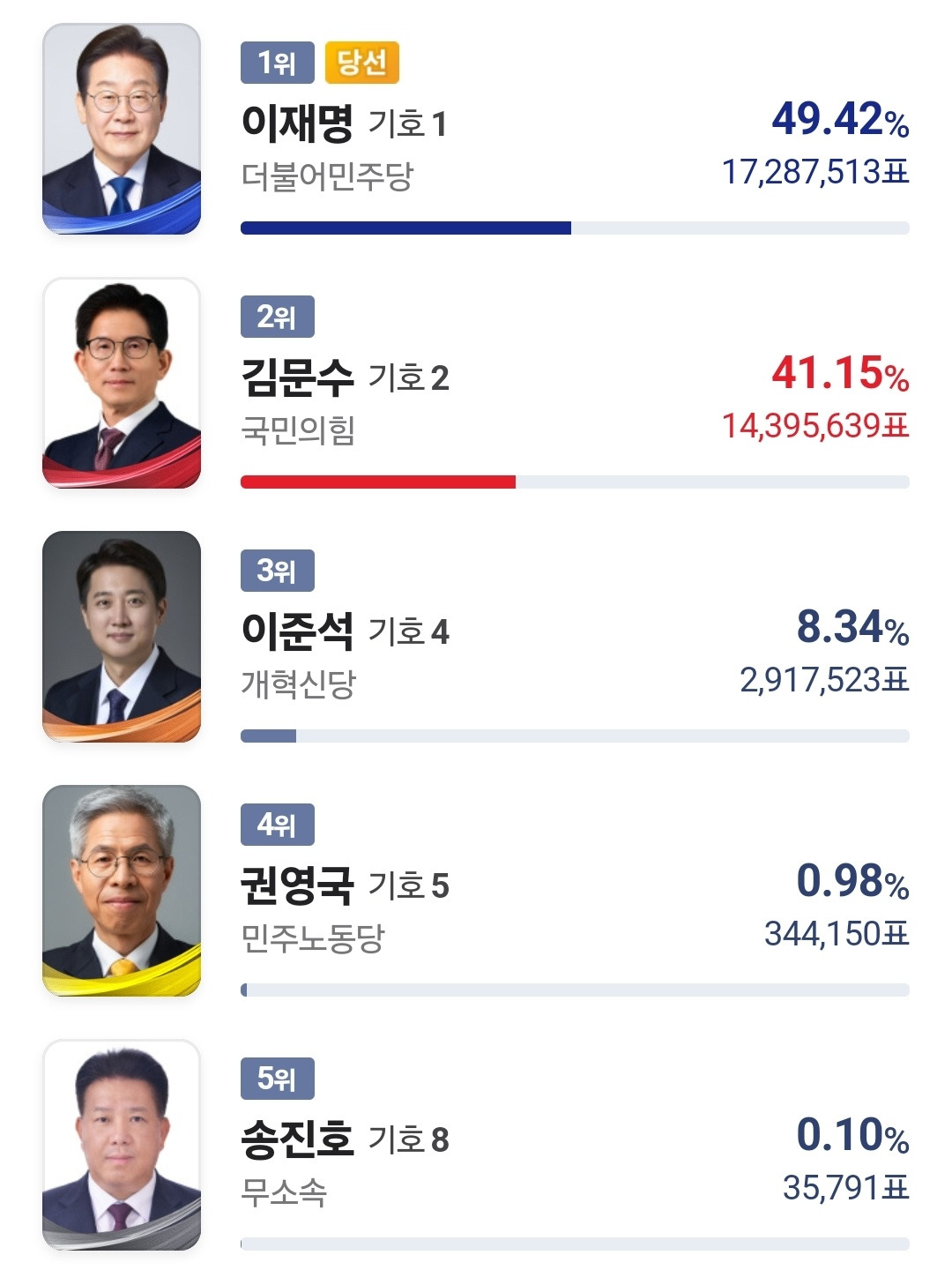 선거는 끝났지만 국민은 여전히 나뉘어 있다. 내 편과 네 편으로 국민을 가르는 정치는 한계를 반복하게 만든다. 절반의 민심으로는 나라를 이끌 수 없다. 지금 필요한 건 축하가 아니라 반성이다. 승리의 기세보다 중요한 건 겸손한 출발이다. 그래야만 이재명 정부는 국민의 신뢰를 회복하고, 진정한 새 시대를 열 수 있다. 49.42%는 단순한 숫자가 아니다. 국민이 정치에 던진 냉정한 질문이다. 이재명 대통령은 이제 그 질문에 답해야 한다.