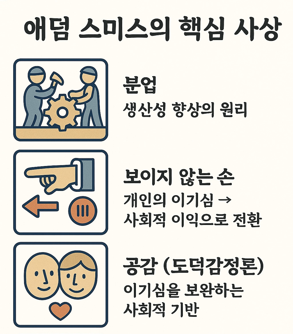 많은 사람들이 스미스를 자유방임주의의 대명사로만 기억하지만 그의 사상은 단순한 시장만능주의와는 거리가 있다. 국가가 국방, 사법 시스템 등 공공재를 공급하고 법과 제도를 통해 시장 질서를 뒷받침해야 함을 분명히 했다. 다만 인간이 타인의 선의보다는 자기 이익을 좇을 때 더 꾸준히 행동한다는 현실 속에서 사회 전체가 번영할 수 있다는 원리를 발견한 것이다.
