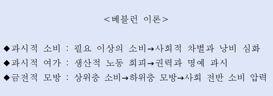 베블런은 과시적 여가와 낭비의 개념을 도입했다. 생산적인 노동을 멀리하고, 실용성과 무관한 활동에 시간을 쓰는 것 자체가 권력과 지위를 드러내는 방식이다. 예를 들어 19세기 유럽의 귀족들이 사냥이나 미술 후원 같은 활동에 몰두하는 것은 자신이 육체노동에서 벗어나 여유를 누릴 수 있는 특권층임을 과시하기 위한 것이다. 또한 부유층의 소비 패턴은 하위 계층으로 전파되며, ‘금전적 모방’을 통한 소비 상승 압력을 만들어낸다. 유명 브랜드의 가방을 들지 못하는 하위계층은 값싼 모조품을 구매하면서 과시 효과를 추구한다. 오늘날 사회관계망서비스(SNS)를 통한 명품 인증이나 값비싼 소비를 과시하는 문화는 베블런이 100여 년 전 분석했던 현상이 여전히 강력하게 작동하고 있음을 보여준다.