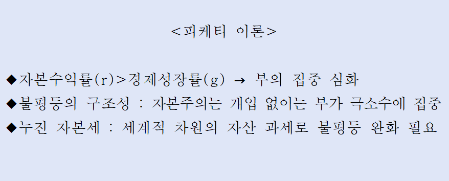 그러나 피케티의 이론은 절대적 진리가 아니다. 불평등의 곡선이 언제나 같은 궤적을 그린다는 보장은 없으며 20세기 중반의 평등화는 전쟁, 경제위기, 복지국가 건설 등 특수한 역사적 조건에 의해 가능했다. 자본수익률과 성장률의 관계는 시대와 국가에 따라 다르게 나타날 수도 있다. 피케티의 도식은 강력한 문제제기이지만 현실을 전부 설명하는 것은 아니다.
