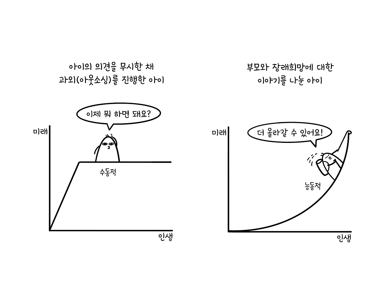 예를 들어보겠습니다. 부모가 아이의 성적표를 보고 내년 입시 준비를 위해 학교 수업 이외에 가정교사(아웃소싱)가 필요하다고 판단했다고 가정해 보겠습니다. 이때 중요한 것은 단순히 좋은 과외 선생님을 찾는 것이라고 생각할 수 있습니다. 그러나 사실 부모로써 고려해야 할 가장 중요한 것은, 왜 학교 수업 외에 추가적인 과외가 필요한지에 대해 아이와 충분히 상의하고, 아이의 의견을 듣는 것입니다. 좋은 과외 선생님이라는 개념은 관점과 상황에 따라 달라질 수 있기 때문입니다.
