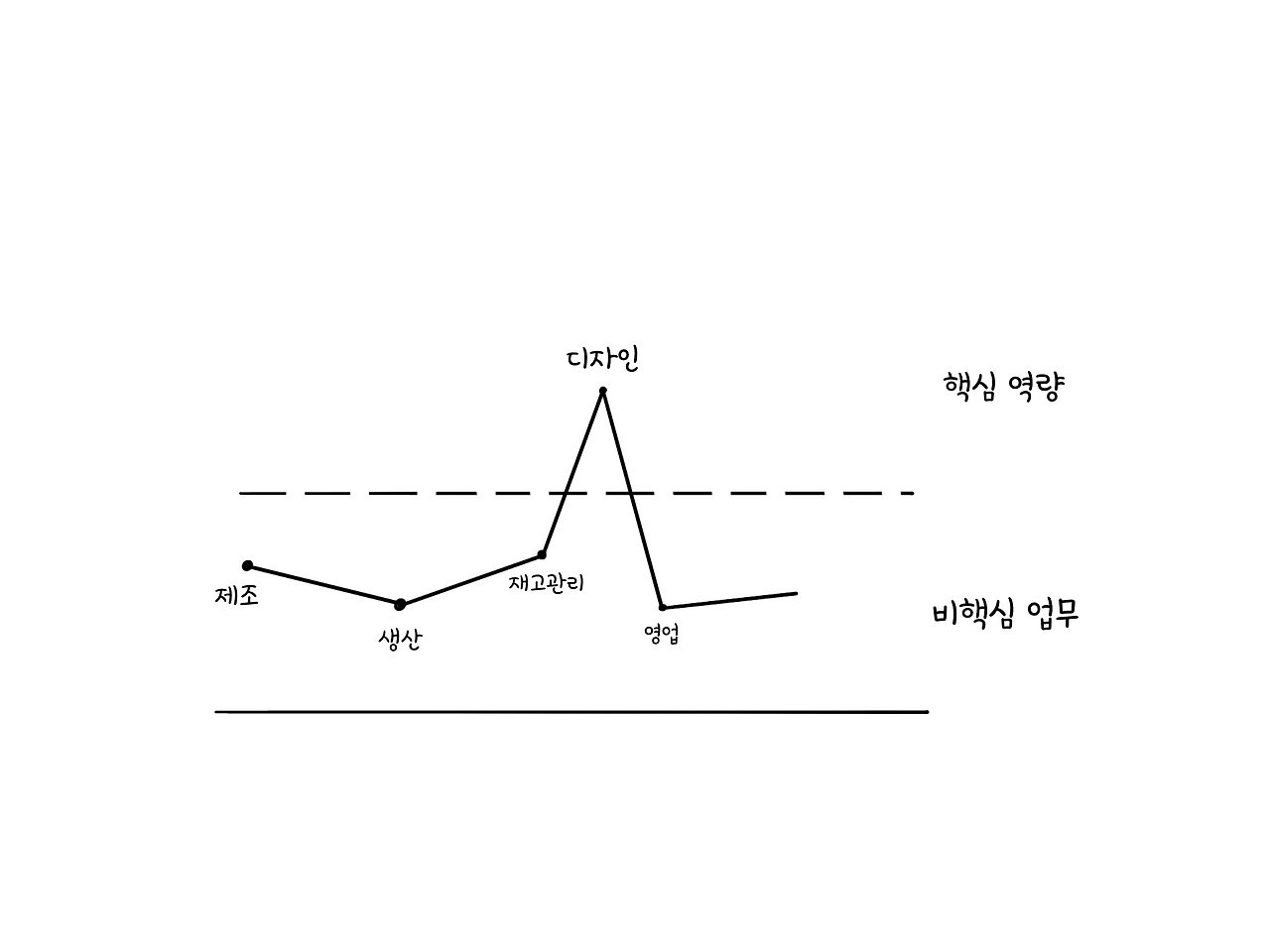 다음 그림은 과외 사례를 한 기업의 핵심역량과 비핵심업무로 이해하기 쉽게 구분한 제조 회사의 사례입니다.