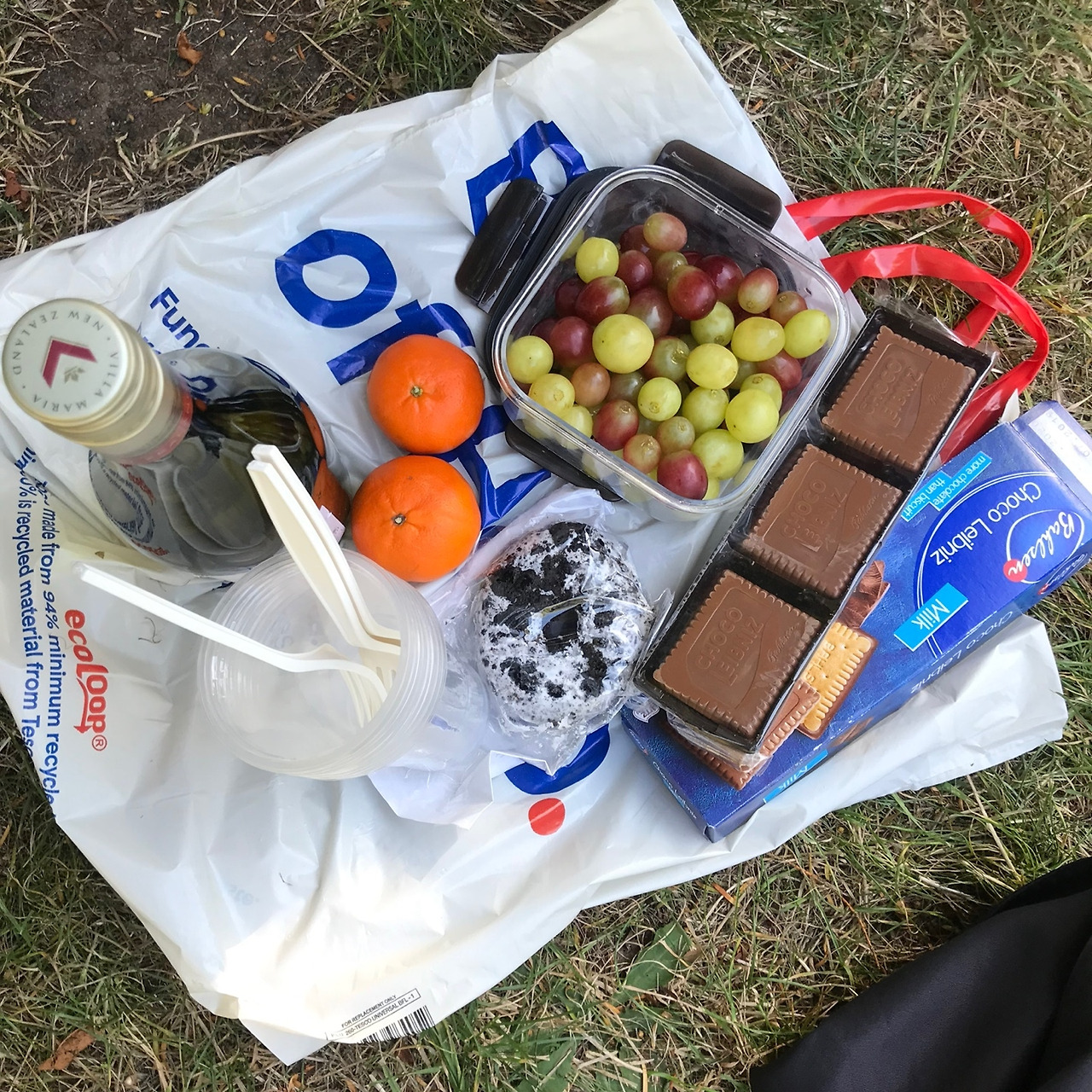 너무 즉흥적으로 런던 여행을 와서, 숙소 문제를 해결해야 했다. 마침 영국으로 교환학생을 간 친구가 있어 그 친구에게 혹시 기숙사에서 하룻밤을 재워 줄 수 있냐고 물었는데, 된다는 것이다! 정말 운이 좋았다. 그렇게 친구의 기숙사에서 하룻밤을 보내고, 다음날에 우리는 함께 피크닉을 가기로 했다. 나와 같은 과 동기 두 명이 함께 영국에서 교환학생 생활을 하고 있어서, 세 명이서 주변 공원으로 갔다. 영국 공원은 한국 공원과 느낌이 사뭇 달랐다. 한국은 잘 꾸며진 공원이 많다면, 영국에는 자연 그대로인 공원이 많다. 사슴도 막 돌아다닌다. 우리는 잔디밭에 앉아서 기숙사에서 싸온 와인, 과일, 도넛, 과자를 맛있게 먹었다.