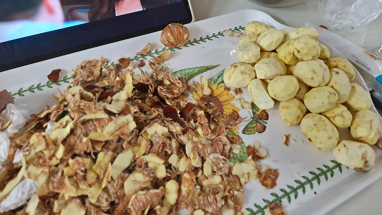 손이 저리고 물집이 생기도록 열심히 밤을 깐다.