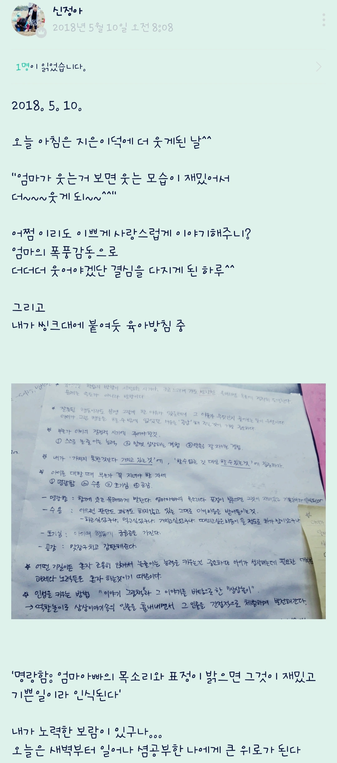 긴 육아의 터널을 지나와보니 '좋은 엄마'라는 것은 따로 있는 것이 아님을 자연스럽게 깨닫게 되었다. 나부터 좋은 사람이 되면 좋은 엄마는 자동으로 따라온다. 내가 아이에게 원하는 데로, 나부터 그런 사람이 되고자 했다. 나도 못 하는 것을 아이들에게 강요하는지, 나에게는 관대하면서 아이들에게는 엄격한 것은 아닌지 매번 자기 검열에 들어간다. 아이를 잘 키우고자 나를 돌아보게 되었고, 나의 욕심이 아이들을 힘들게 하지 않는지 고민하며 나를 돌아보았다.