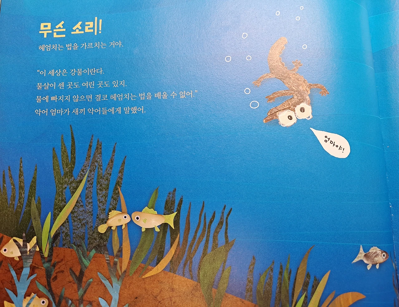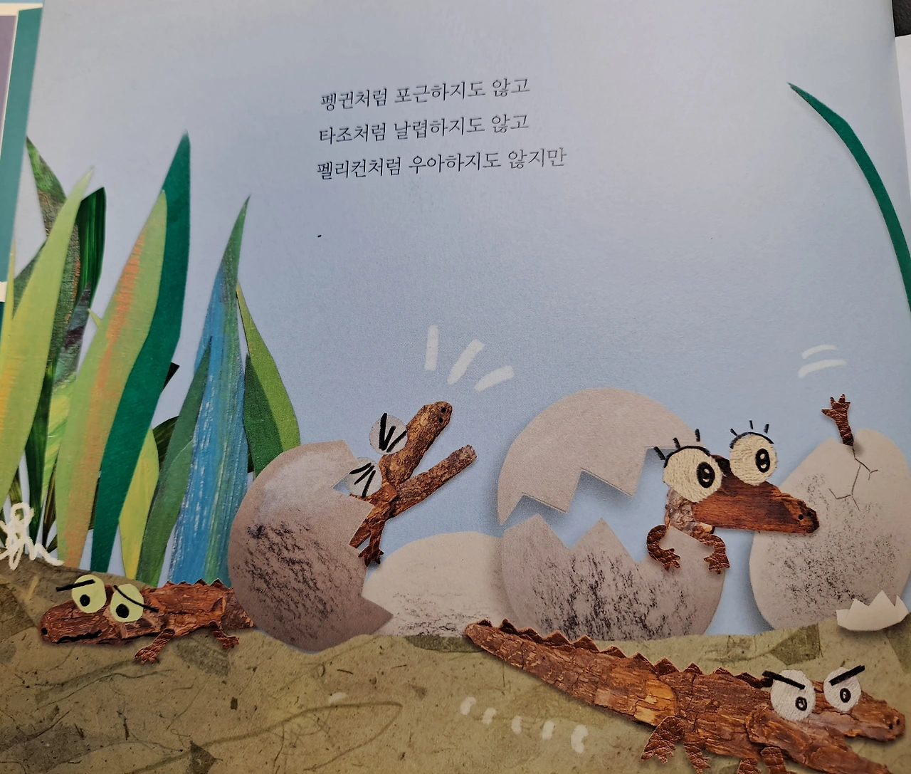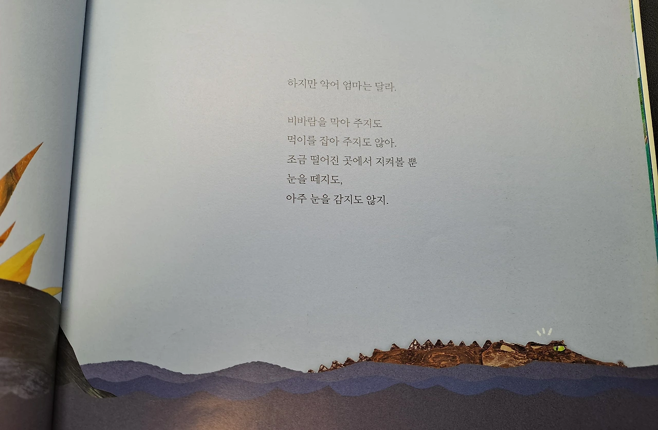 하지만 악어 엄마는 달라.비바람을 막아 주지도먹이를 잡아 주지도 않아.조금 떨어진 곳에서 지켜볼 뿐눈을 떼지도아주 눈을 감지도 않지.