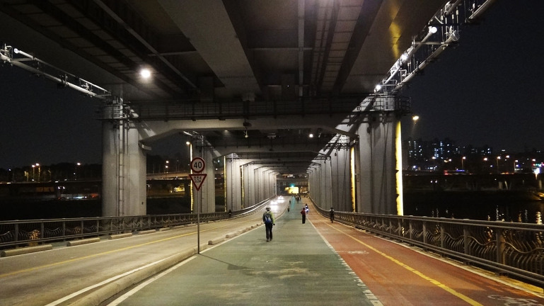 반포대교 남단. 그곳은 한강공원 그 어느 곳보다 밝고 혼잡하다. 하지만 겨울만큼은 그렇지 않다. 저 멀리 시베리아에서 온 한기를 품은 강바람은 내 뺨을 차갑게 식힌다. 그러나 20분 가까이 뛰는 동안 달궈진 몸의 열기로 강바람을 기어이 뚫고 잠수교 남단으로 들어선다. 사방이 뚫린 시멘트 동굴. 처음 이 곳을 본 소감이었다. 그 어느 곳보다 인위적이고 차가운 공간 속에서 사람들이 오랜 시간 동안 하나하나 서울에 수놓은 풍경을 바라보며 뛰는 순간이 이 야간 한강 러닝의 클라이맥스이다. 서서히 높아지는 경사에 숨도 더 가빠지며 쉴 새 없이 움직이는 다리도 좀 뻐근해진다. 그래도 포기하기는 싫다. 벌써 난 절반이나 뛰었다. 그리고 추위에 굳은 몸이 이제야 풀렸다. 잠수교 언덕 정상에 다다라 남은 여정을 바라보며 마음 한 번 다지며 내려간다.