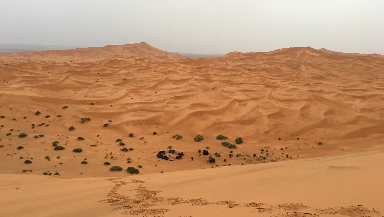 달래는 말인 줄은 알았지만 거짓 없는 알리의 그 웃음과 말투에 나는 쉽게 한숨 놓았다. 이어서 알리는 이 곳이 오아시스이고 불과 몇 년 전까지 물이 있던 곳이라 말했다. 지금도 지하에는 적지 않게 물이 남아있어 끌어올려 쓴다고 알려줬다. 비 온 뒤의 사막의 풍경도 꽤 매력적이라는 말과 함께 베이스캠프 뒤로 높이 솟은 모래언덕 위로 올라가 사막 전경을 보길 권유했다.