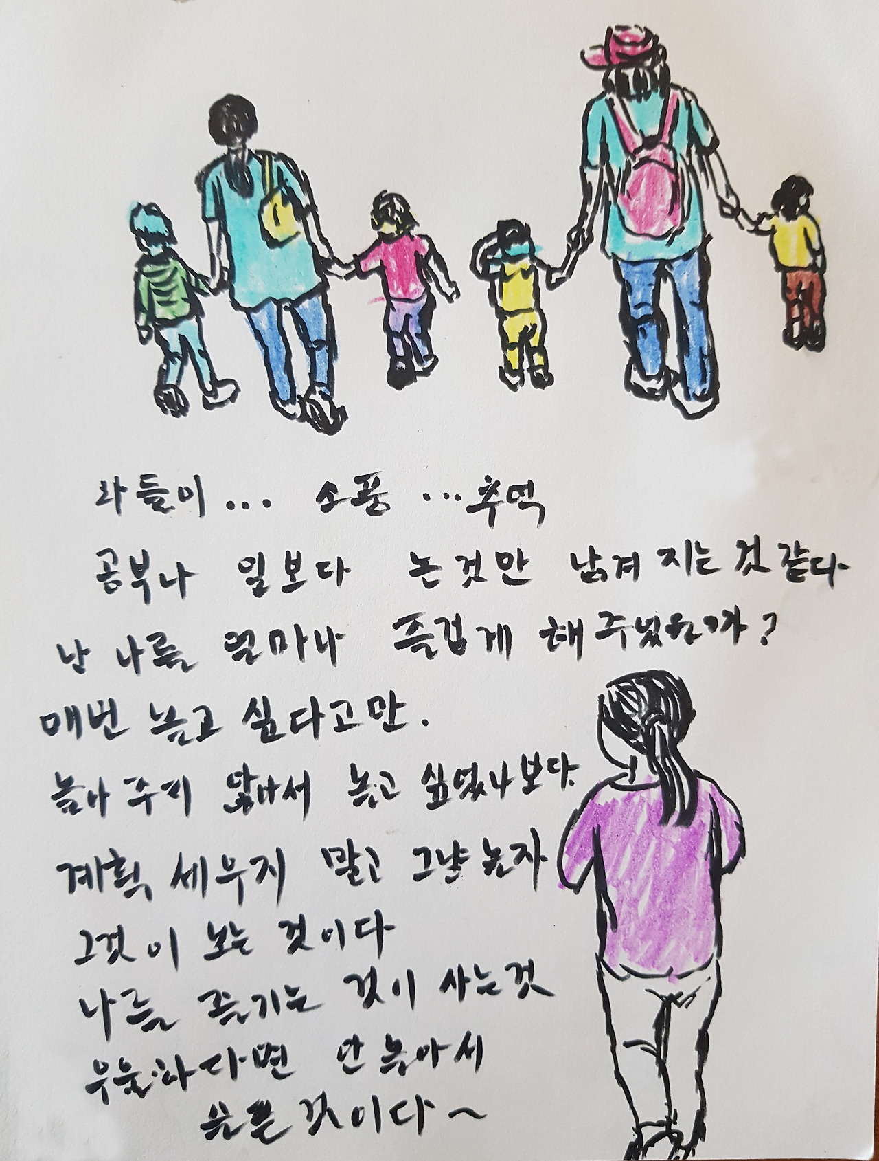 마냥 슬프고 우울해서 창밖을 내다보다가 엄마 손잡고 놀러 가는 아이들의 조잘대는 소리에 '아~ 나도 놀고 싶다'는 생각이 들었다.