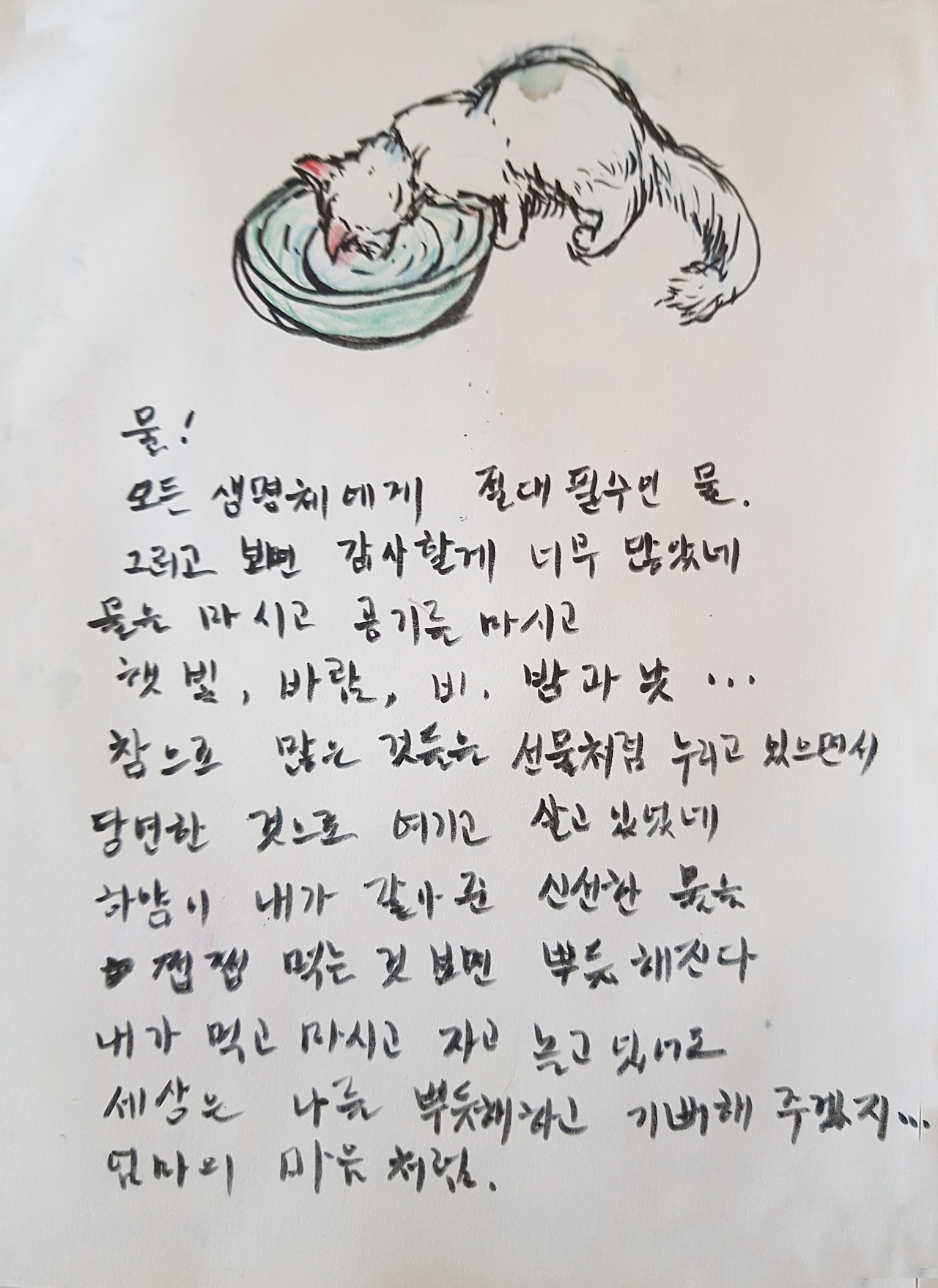 고양이에게 신선한 물만 주어도 병이 들지 않는다. 사람도 마찬가지이다. 그러고 보면 모든 생물이 물 없이는 살 수 없다.