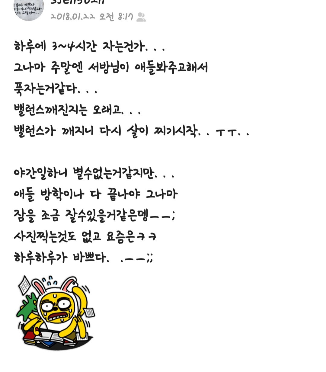 아이들이 등원 준비를 하는 시간인 7시 30분까지 쪽잠을 자고, 똑같은 하루 일과를 돌았다.